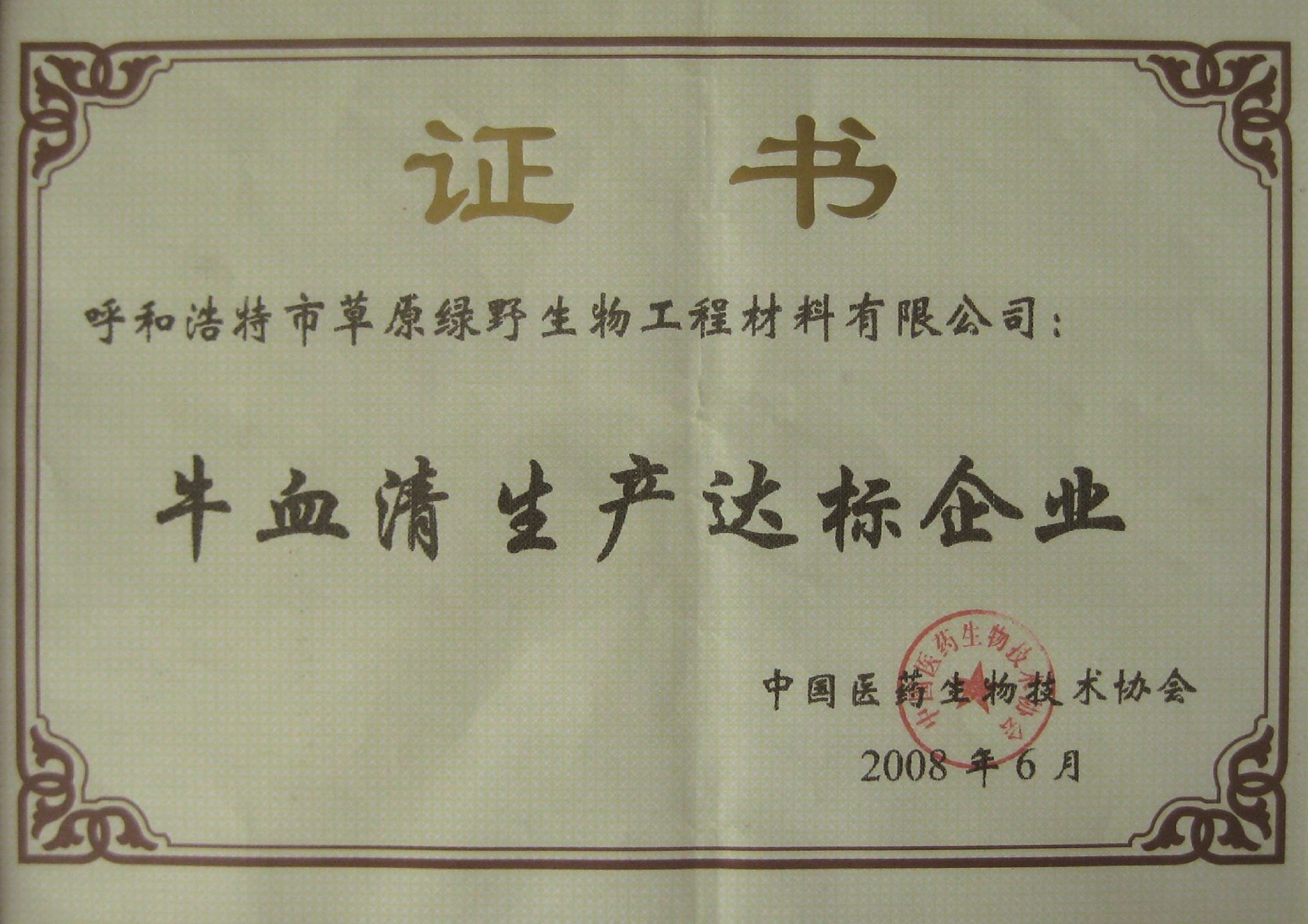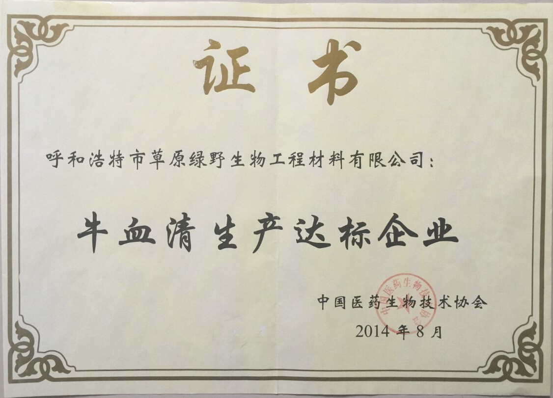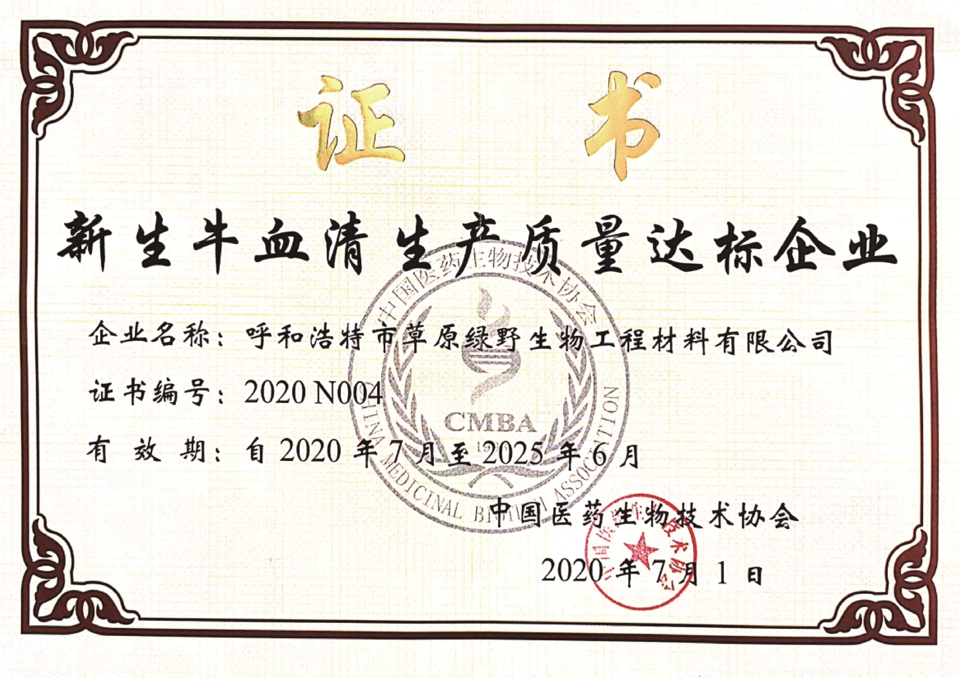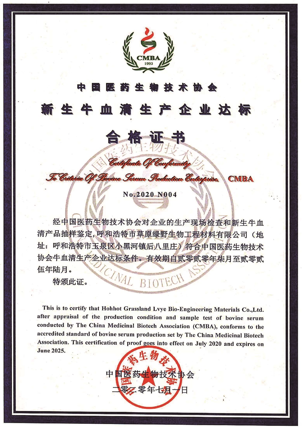 公司至今已多次通過中國醫藥生物技術協會《牛血清生產企業達標》認證、《牛血清生產質量達標企業》認證。ISO9001質量管理體系認證、ISO45001職業健康安全管理體系認證、ISO14001環境管理體系認證、ISO13485醫療器械質量管理體系認證、ISO50001能源管理體系認證、GB/T29490知識產權合規管理體系認證、AAA級信用企業認證、A級納稅單位評審等。