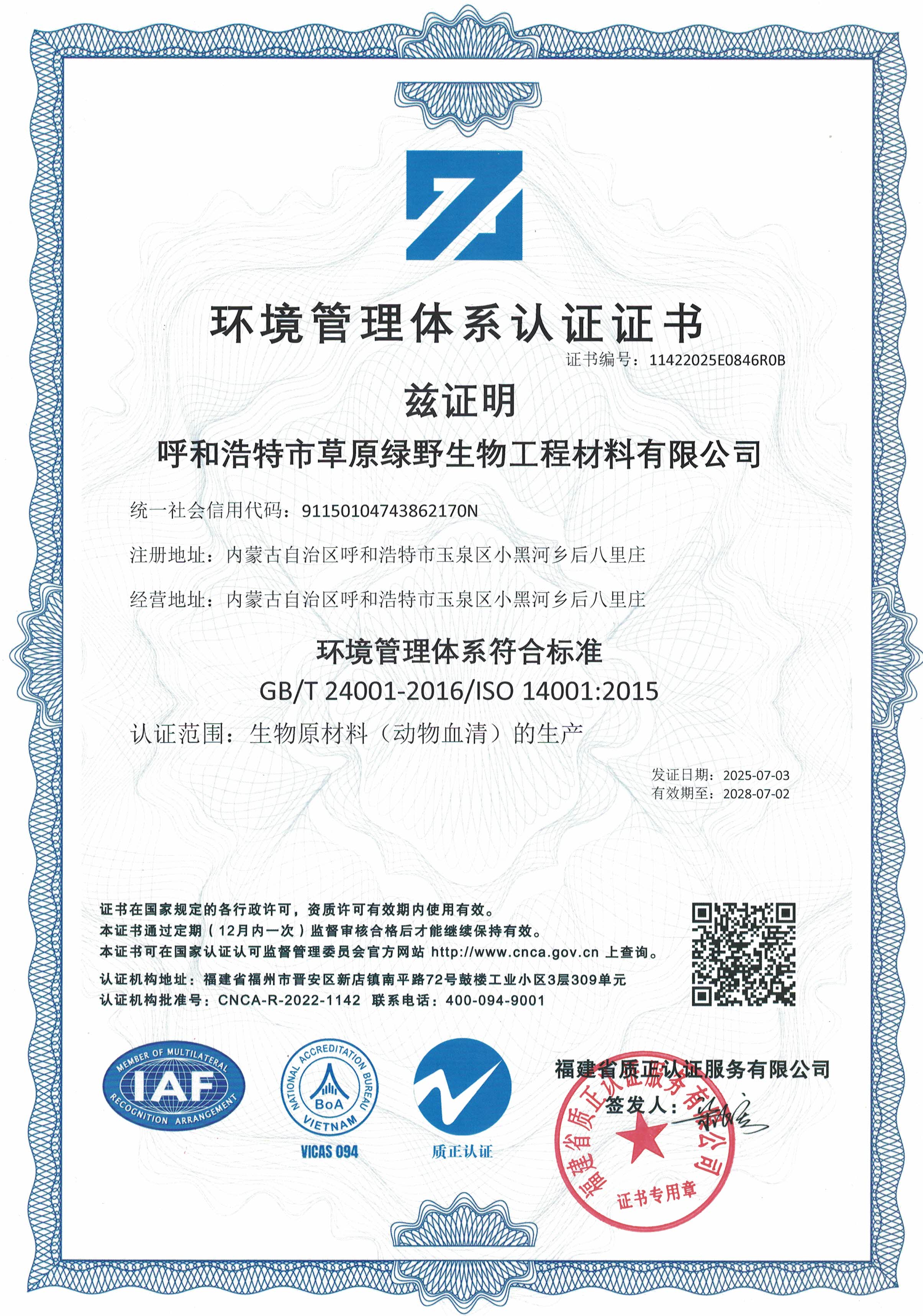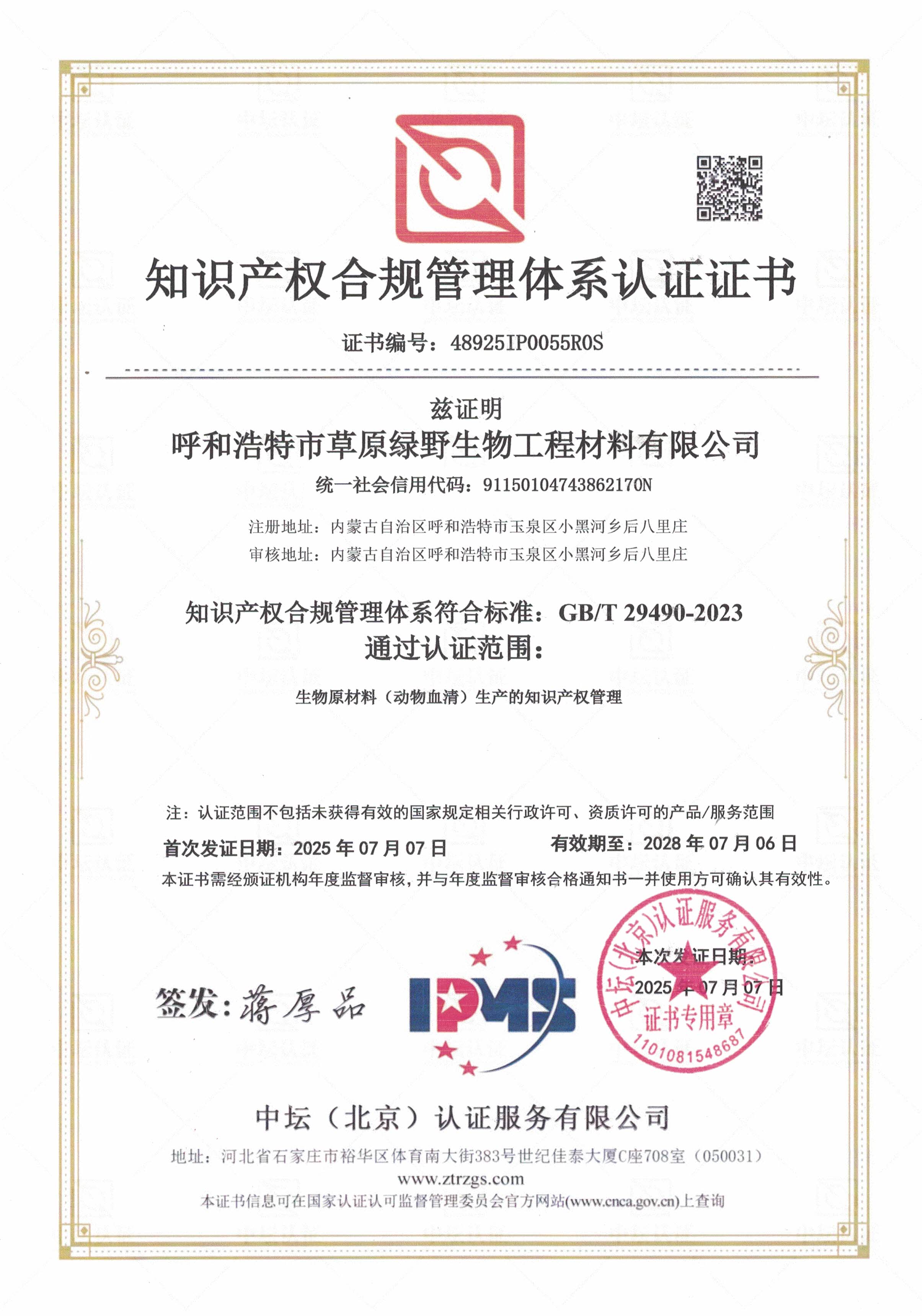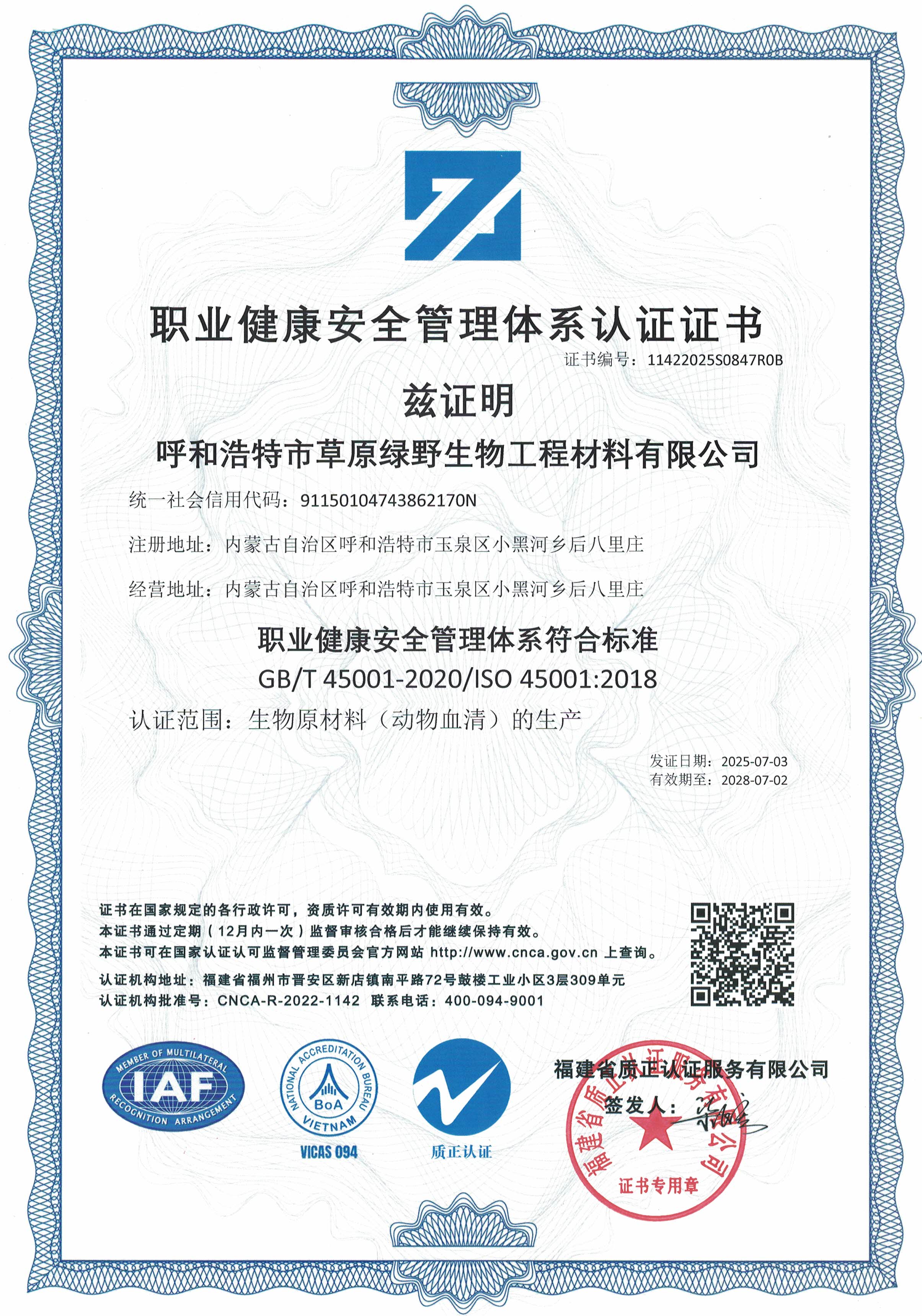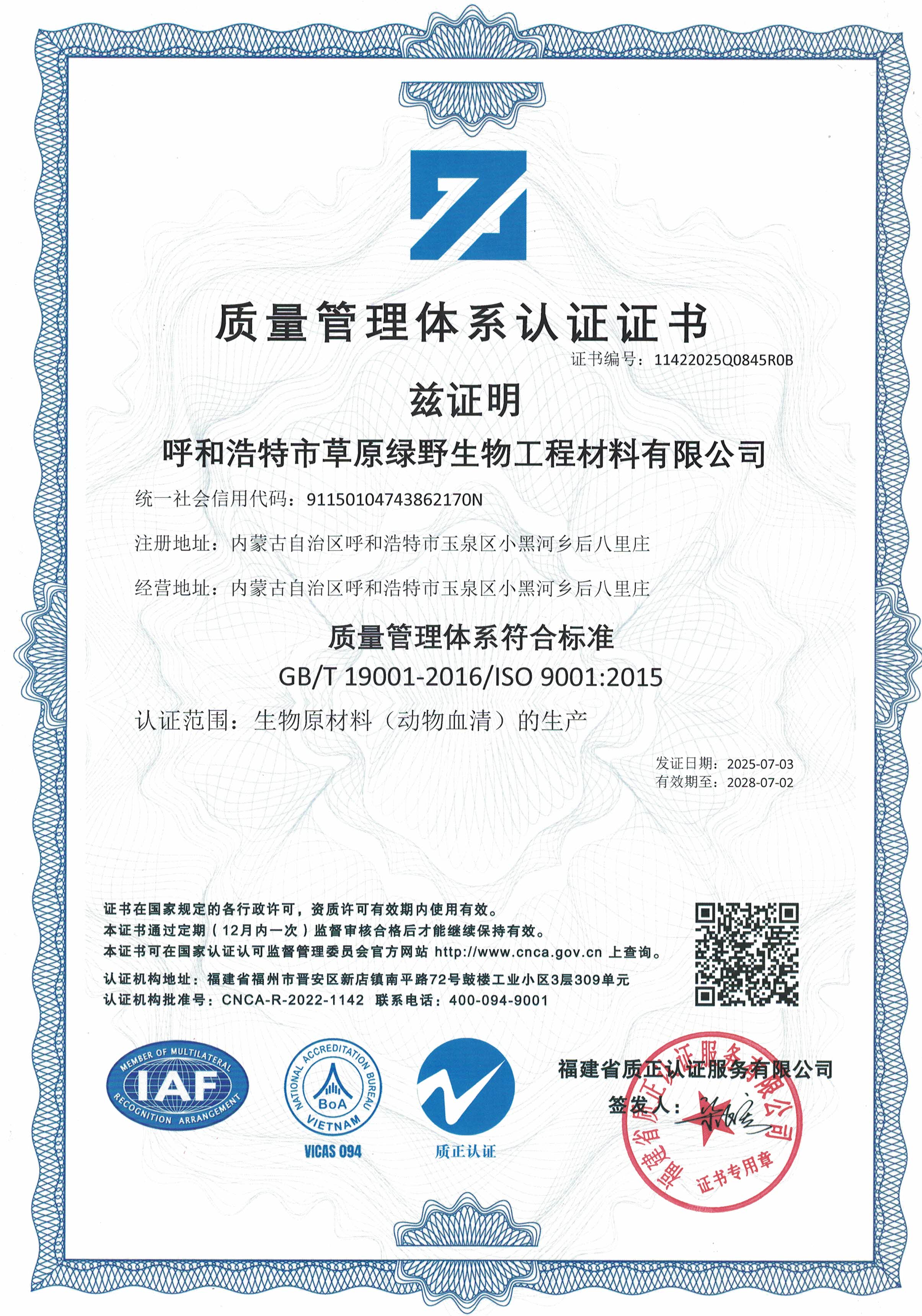 公司至今已多次通過中國醫藥生物技術協會《牛血清生產企業達標》認證、《牛血清生產質量達標企業》認證。ISO9001質量管理體系認證、ISO45001職業健康安全管理體系認證、ISO14001環境管理體系認證、ISO13485醫療器械質量管理體系認證、ISO50001能源管理體系認證、GB/T29490知識產權合規管理體系認證、AAA級信用企業認證、A級納稅單位評審等。